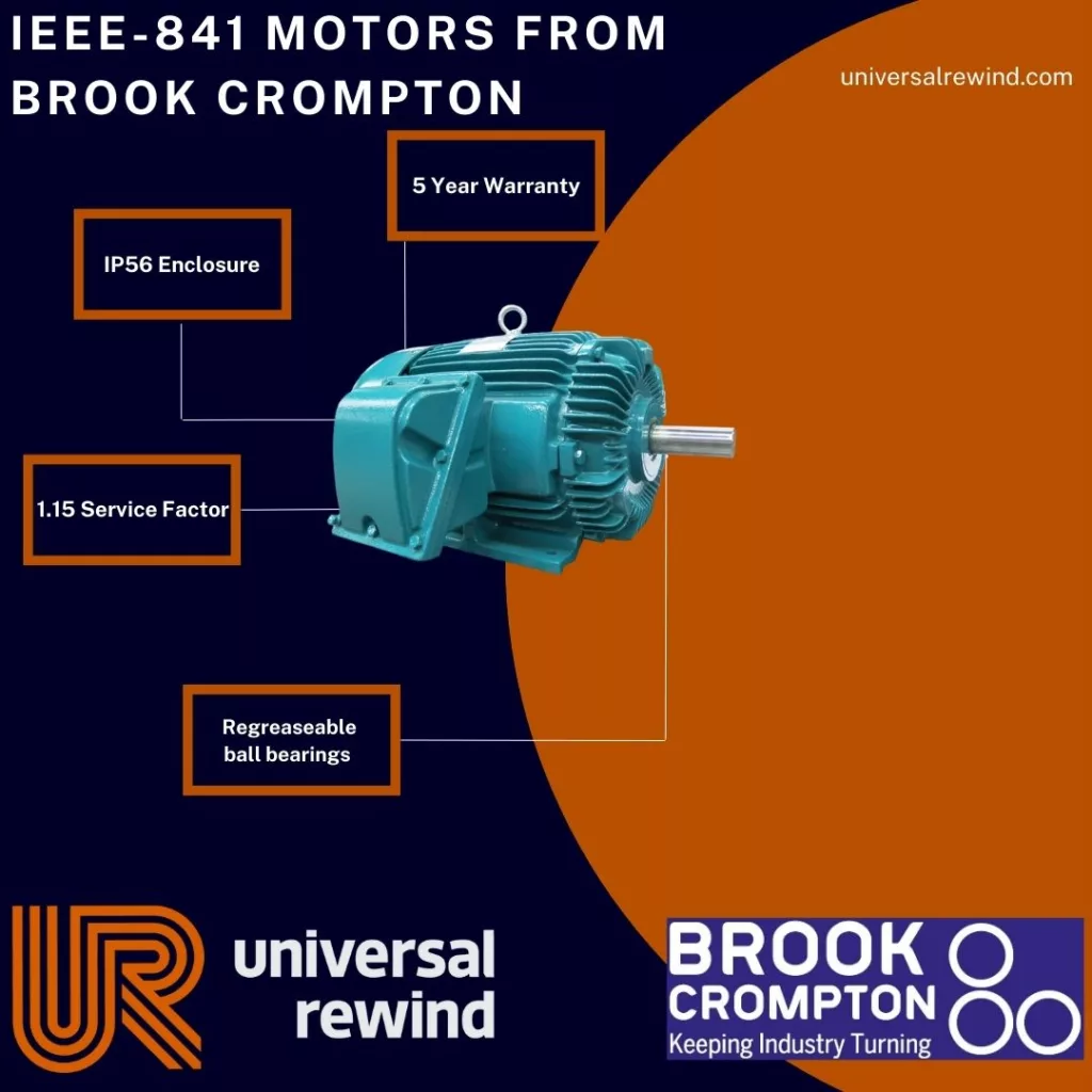 IEEE841 Motors are a specific class of electric motors that adhere to the standards outlined by the IEEE (Electrical and Electronics Engineers). These standards are important for motors used in the petrochemical and refining industries. These industries have a higher standard when it comes to reliability, efficiency, and performance. Universal Rewind has a unique opportunity with the Brook Crompton brand of IEEE841 motors (while supplies last). These are premium motors that are nominally more than a general-purpose motor but will last significantly longer than your GP motor.